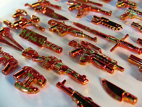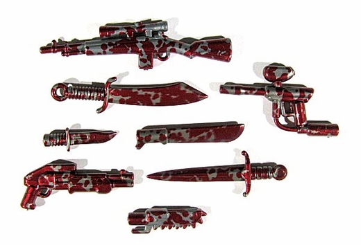 There is an assortment of colors for each item, including 24K gold ray guns, tactical swords, and blood-spattered weapons.