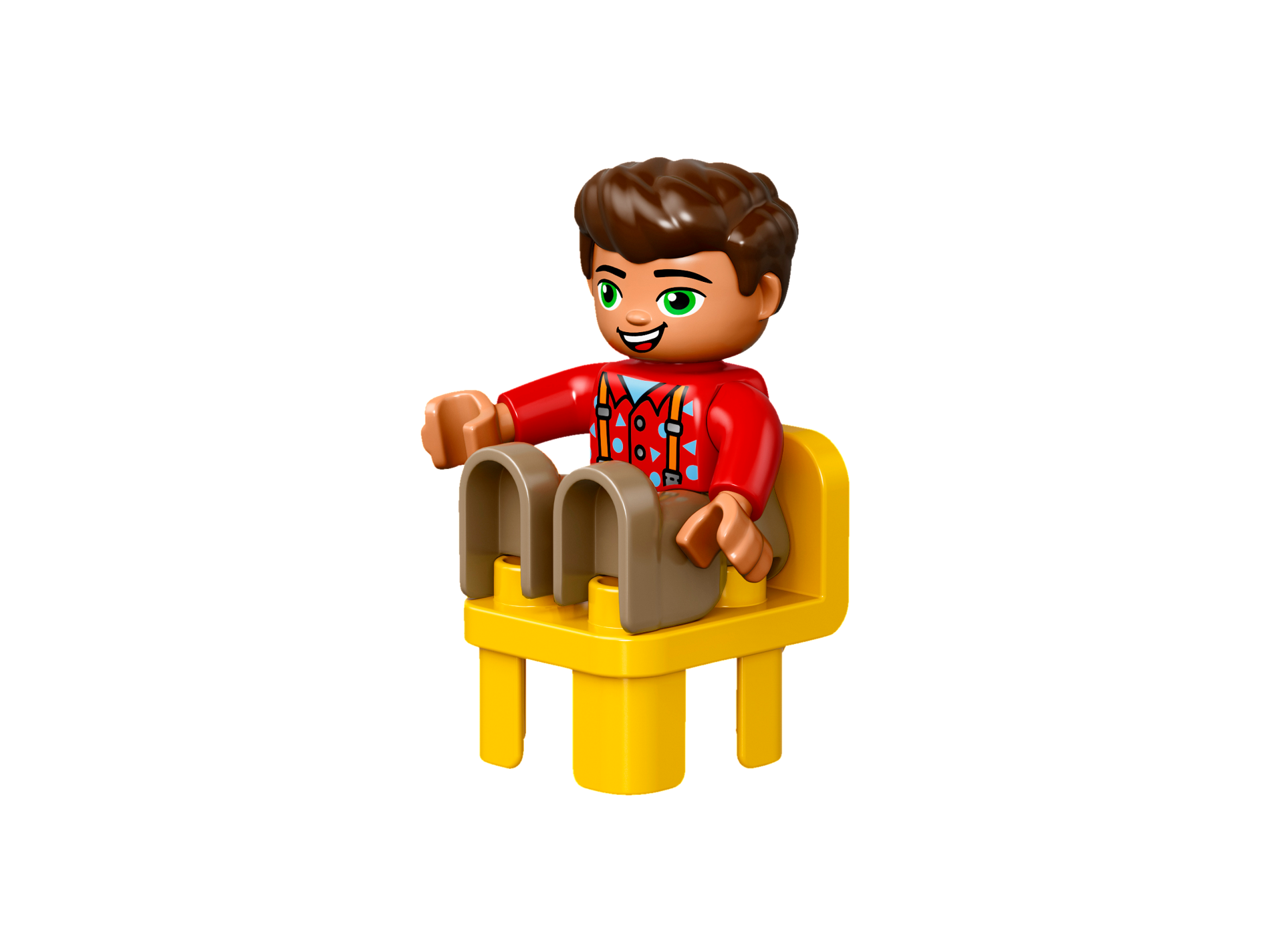 Duplo Figure Lego Ville, Male, Dark Tan Legs, Red Top with Suspenders, Dark Brown Hair