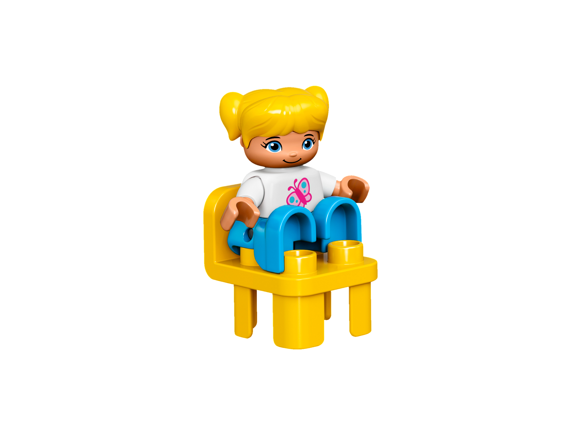Duplo Figure Lego Ville, Child Girl, Dark Azure Legs, White Top with Pink Butterfly, Yellow Hair with Ponytails
