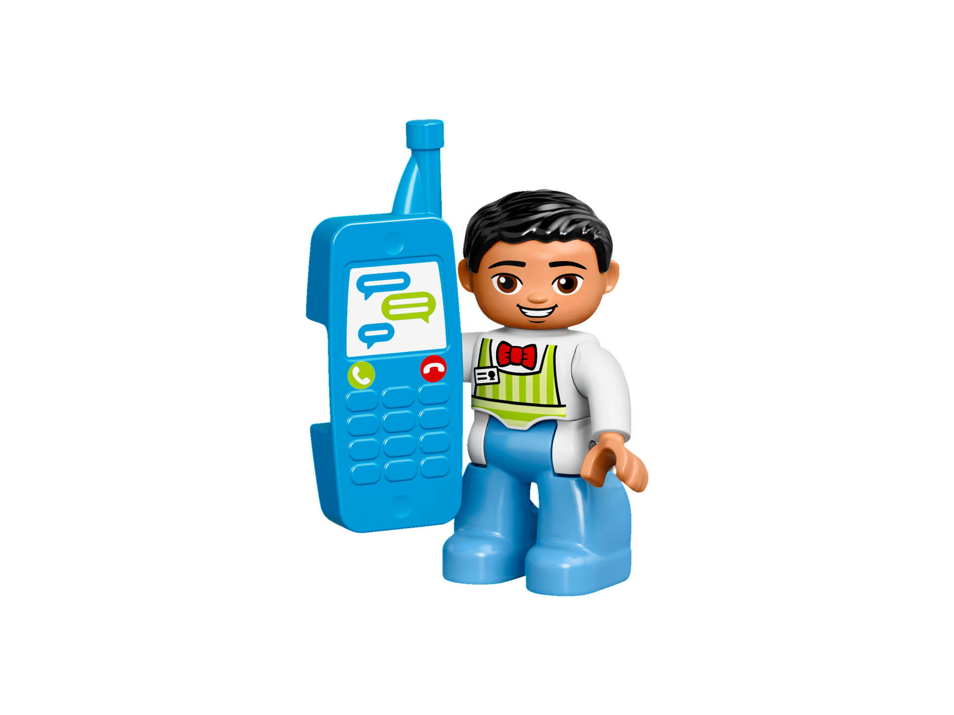 Duplo Figure Lego Ville, Male, Medium Blue Legs, Lime Striped Apron, Red Bow Tie, Black Hair