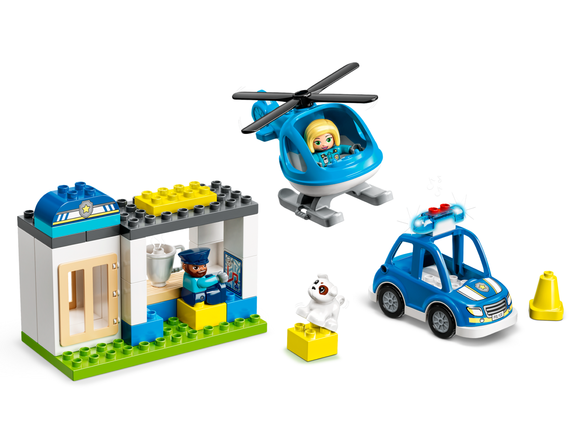 Duplo Car Body High Cab 2 Top Studs with Silver, White and Bright Light Yellow Headlights, Grille, Bumper, Badge with Star, and 'POL1CE' Pattern