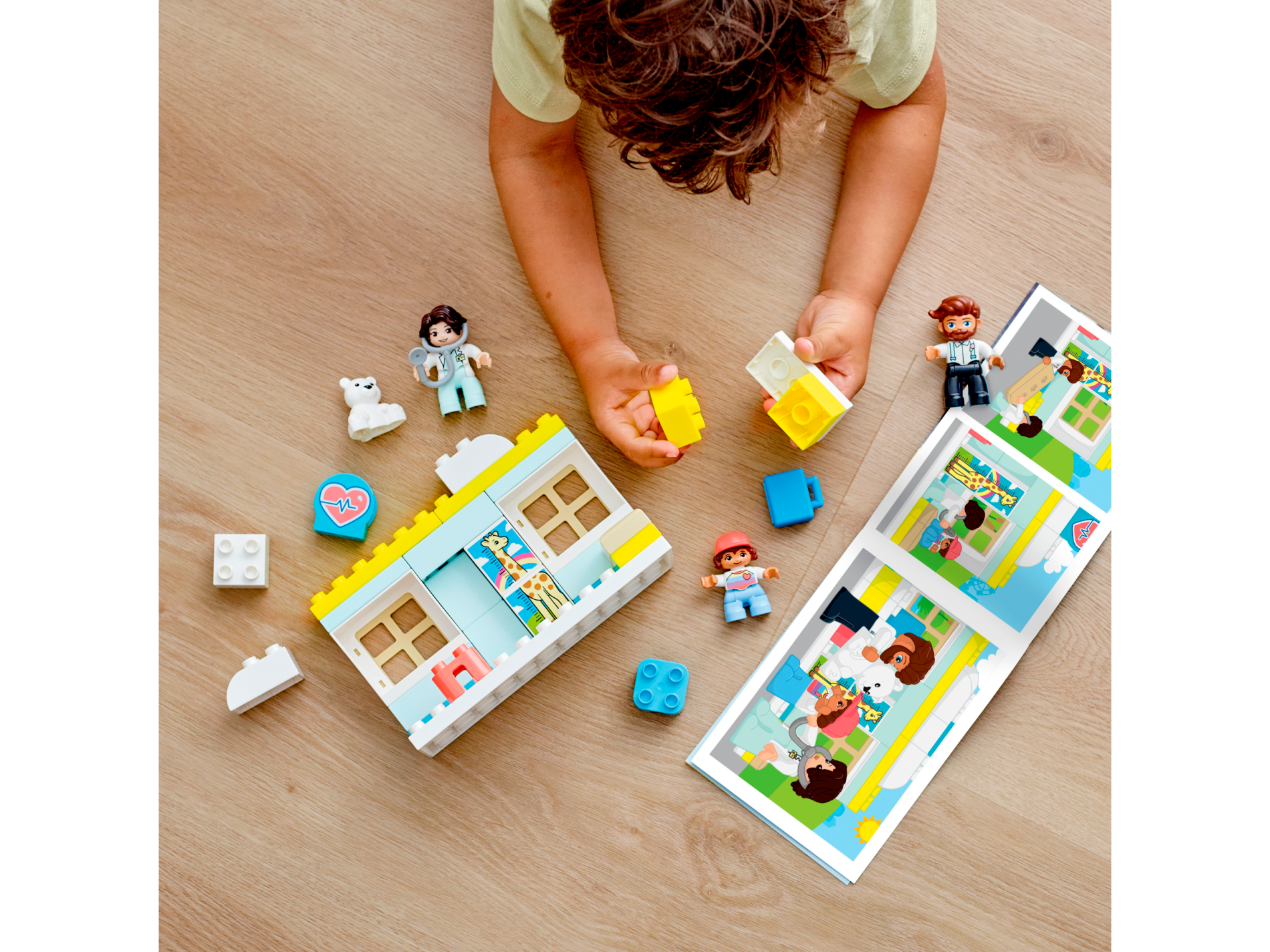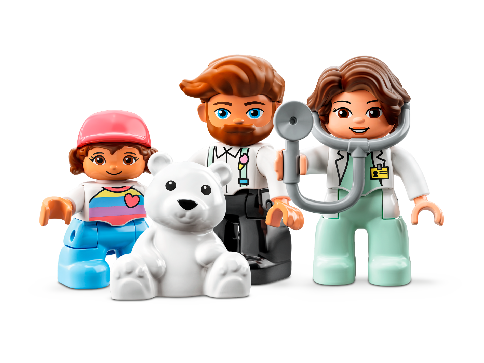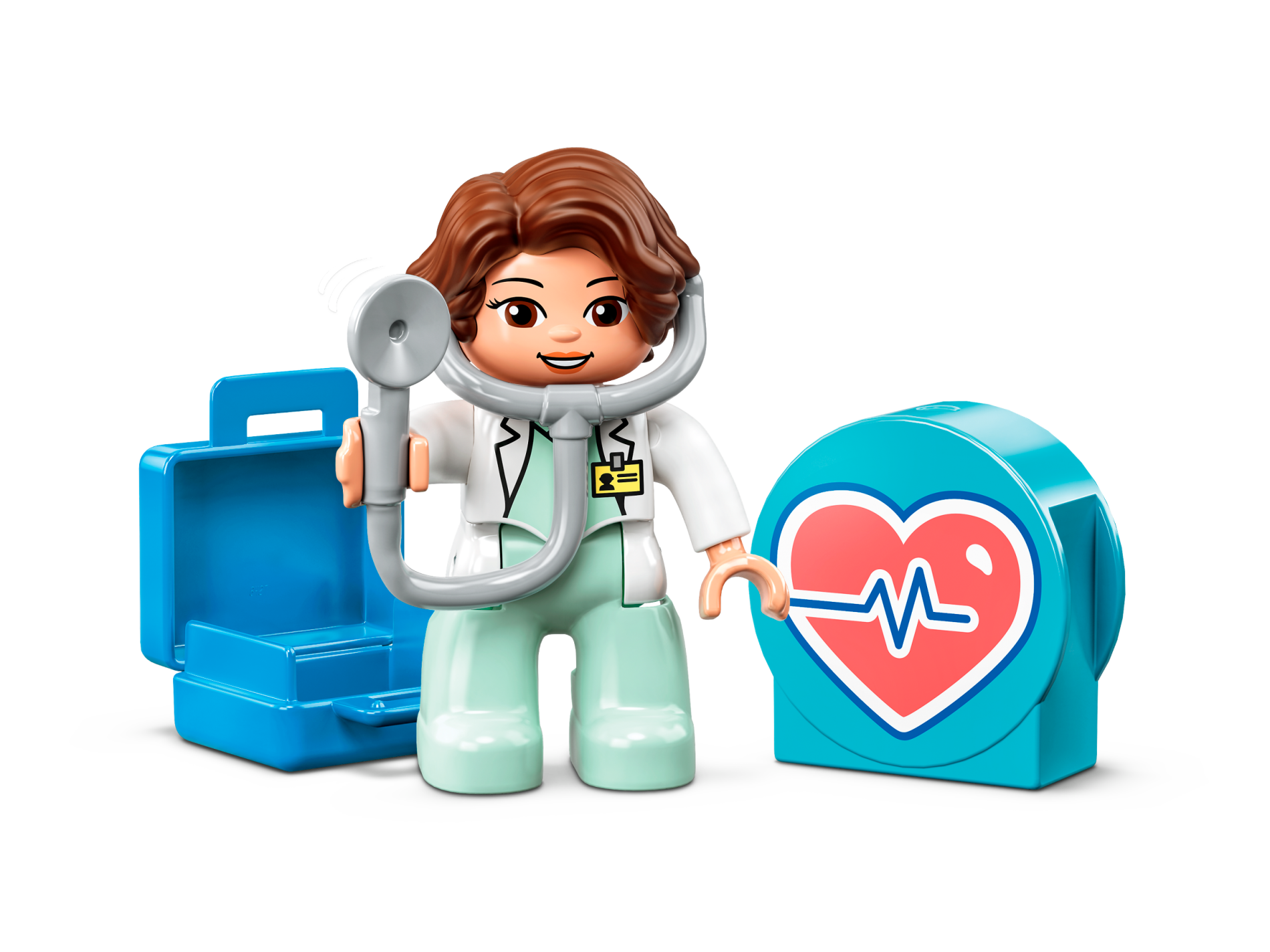 Duplo Figure Lego Ville, Female Medic, Light Aqua Legs, White Top with ID Badge, White Arms, Dark Brown Hair, Attached Stethoscope