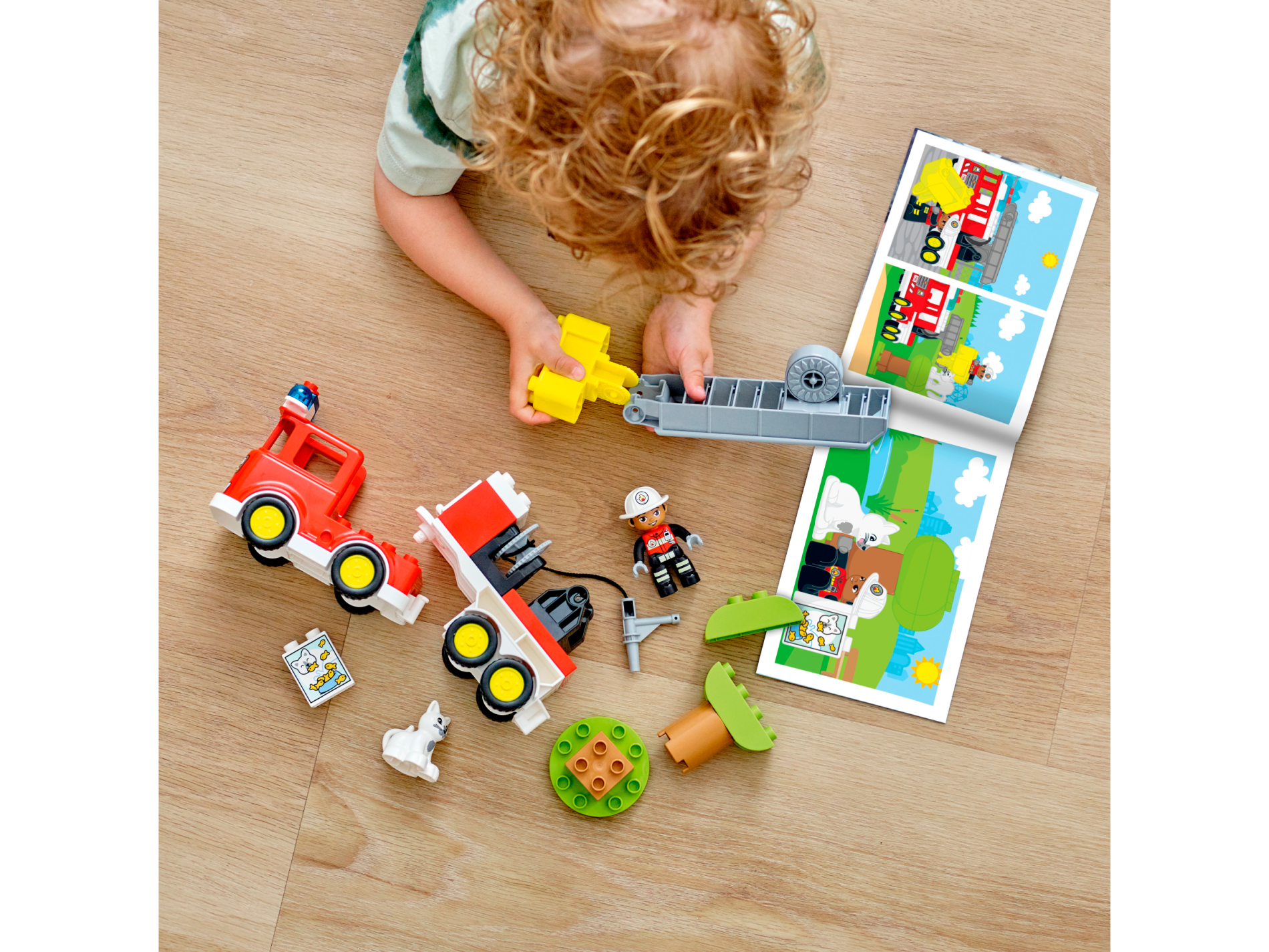 Duplo Figure Lego Ville, Male Firefighter, Black Legs with Reflective Stripes, Red Vest with Silver Fire Badge and Radio, Medium Nougat Face, White Helmet with Fire Badge