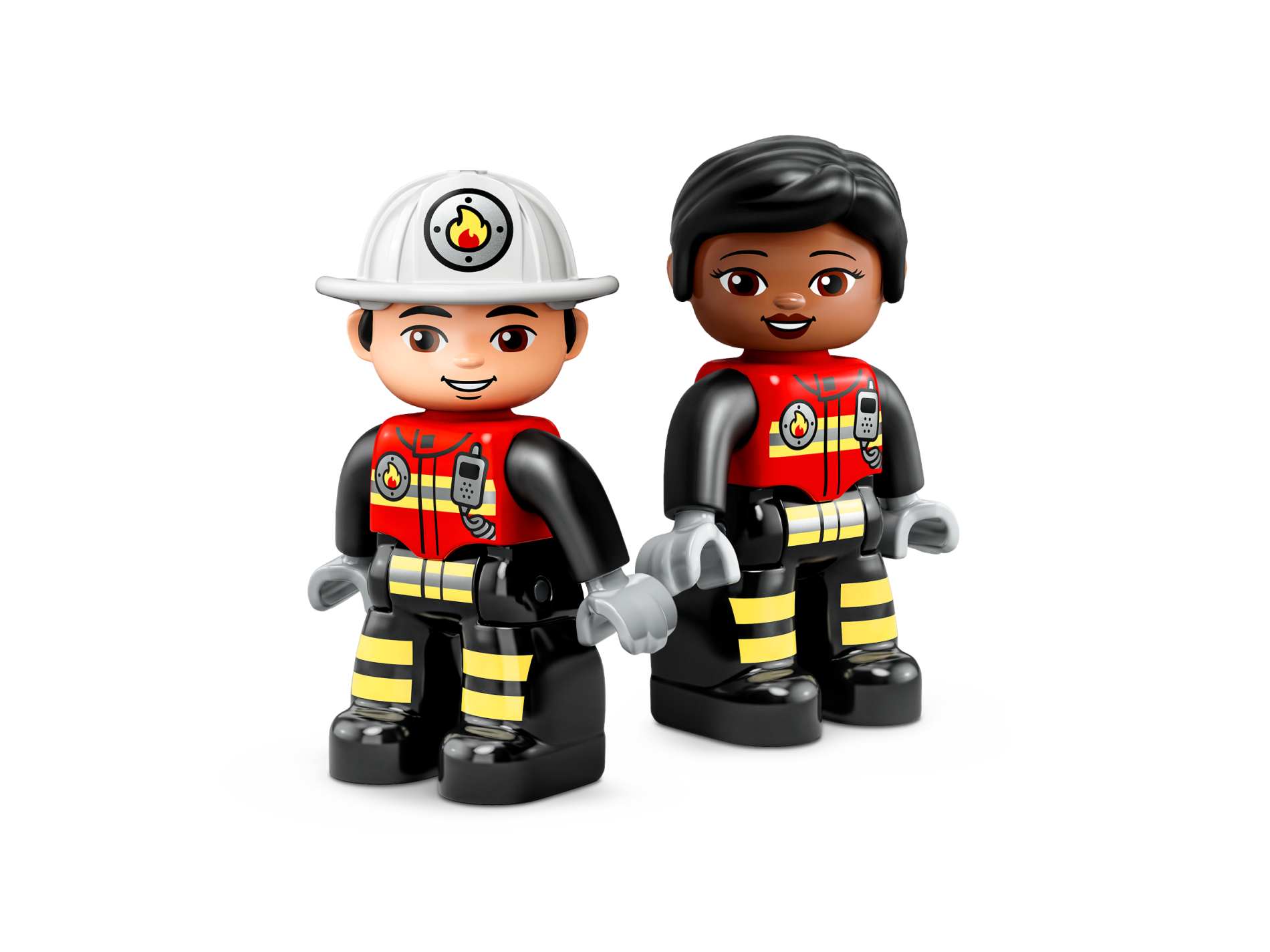 Duplo Figure Lego Ville, Female Firefighter, Black Legs with Reflective Stripes, Red Vest with Silver Fire Badge and Radio, Black Hair, Brown Eyes