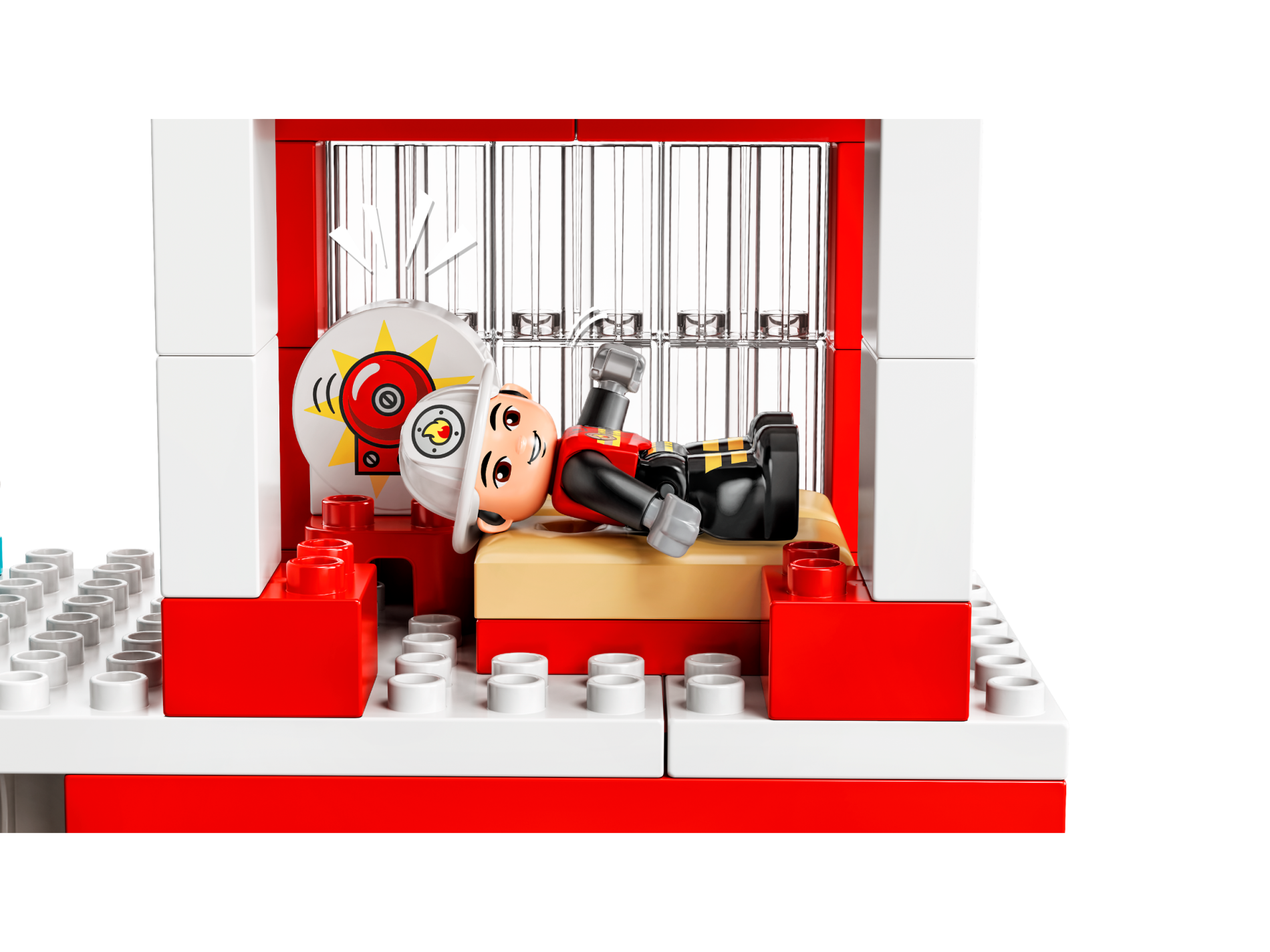 Duplo, Brick 1 x 2 x 2 Round Top, Cut Away Sides with Red Fire Alarm Bell, Bright Light Yellow Star Pattern