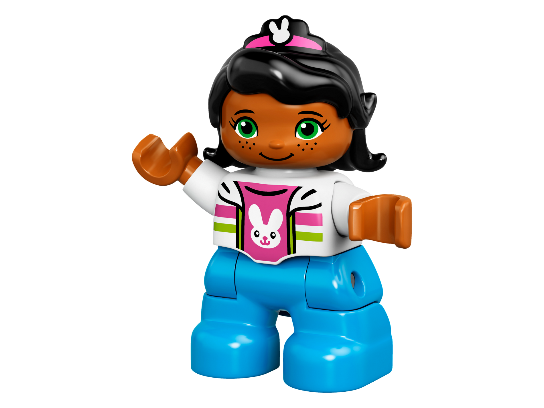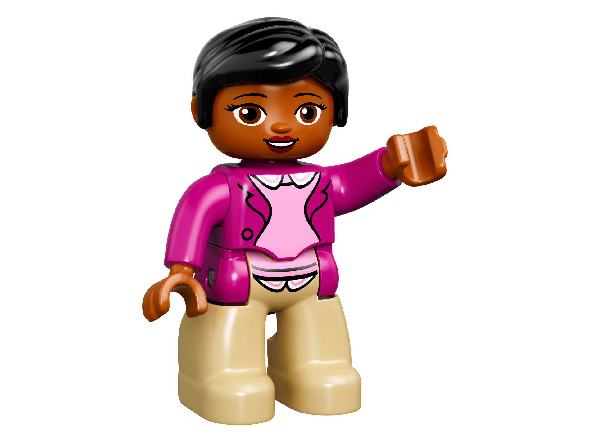 Duplo Figure Lego Ville, Female, Tan Legs, Magneta Jacket and Pink Blouse Pattern, Black Hair, Brown Eyes
