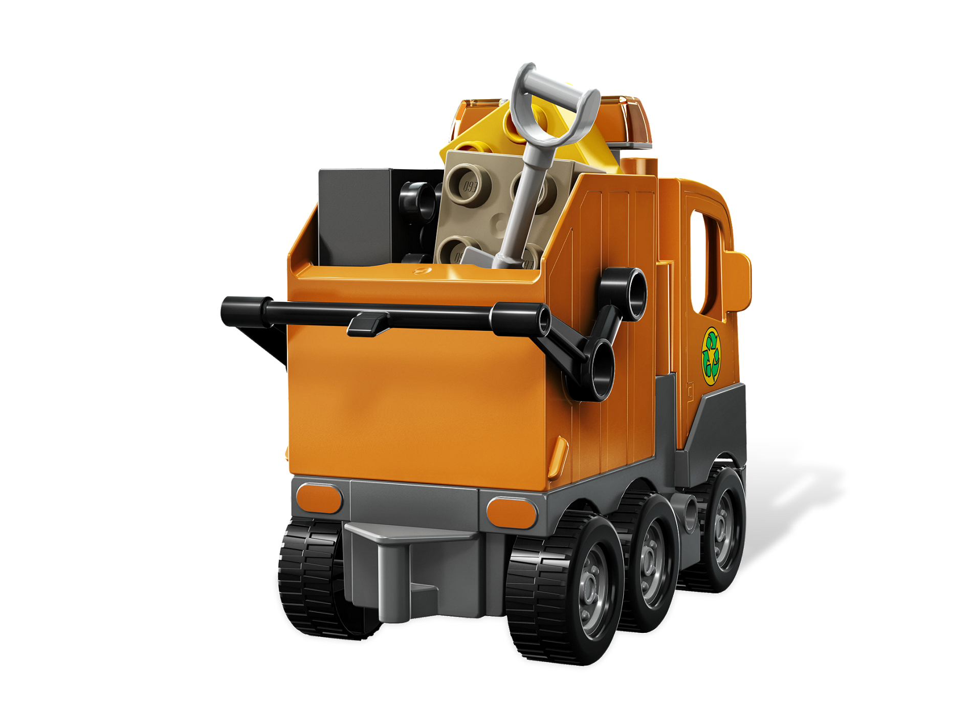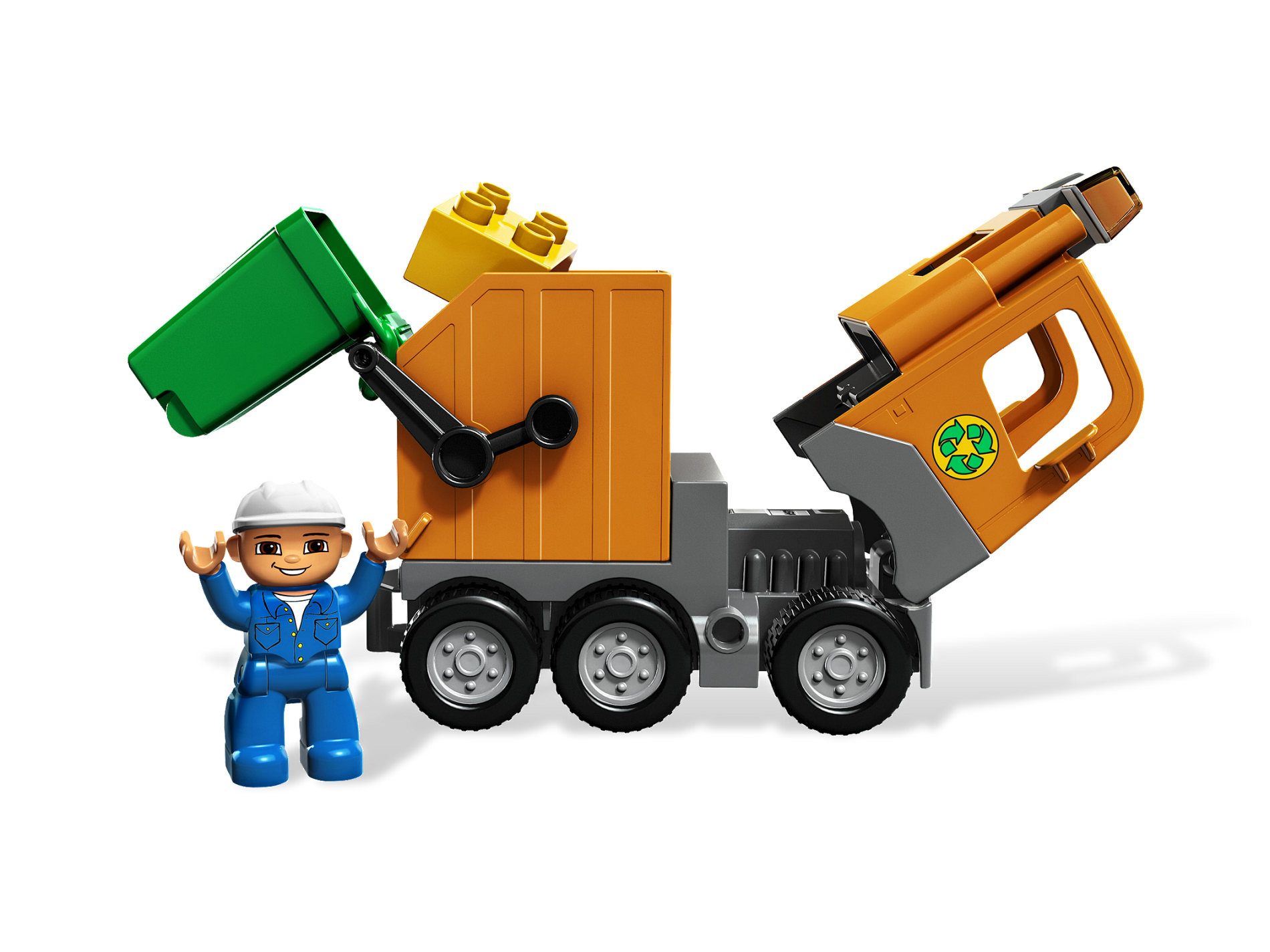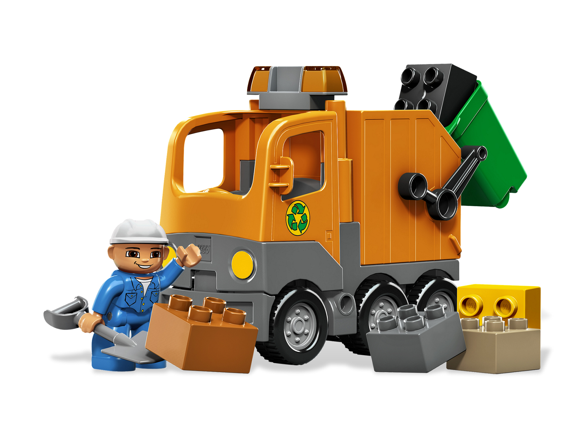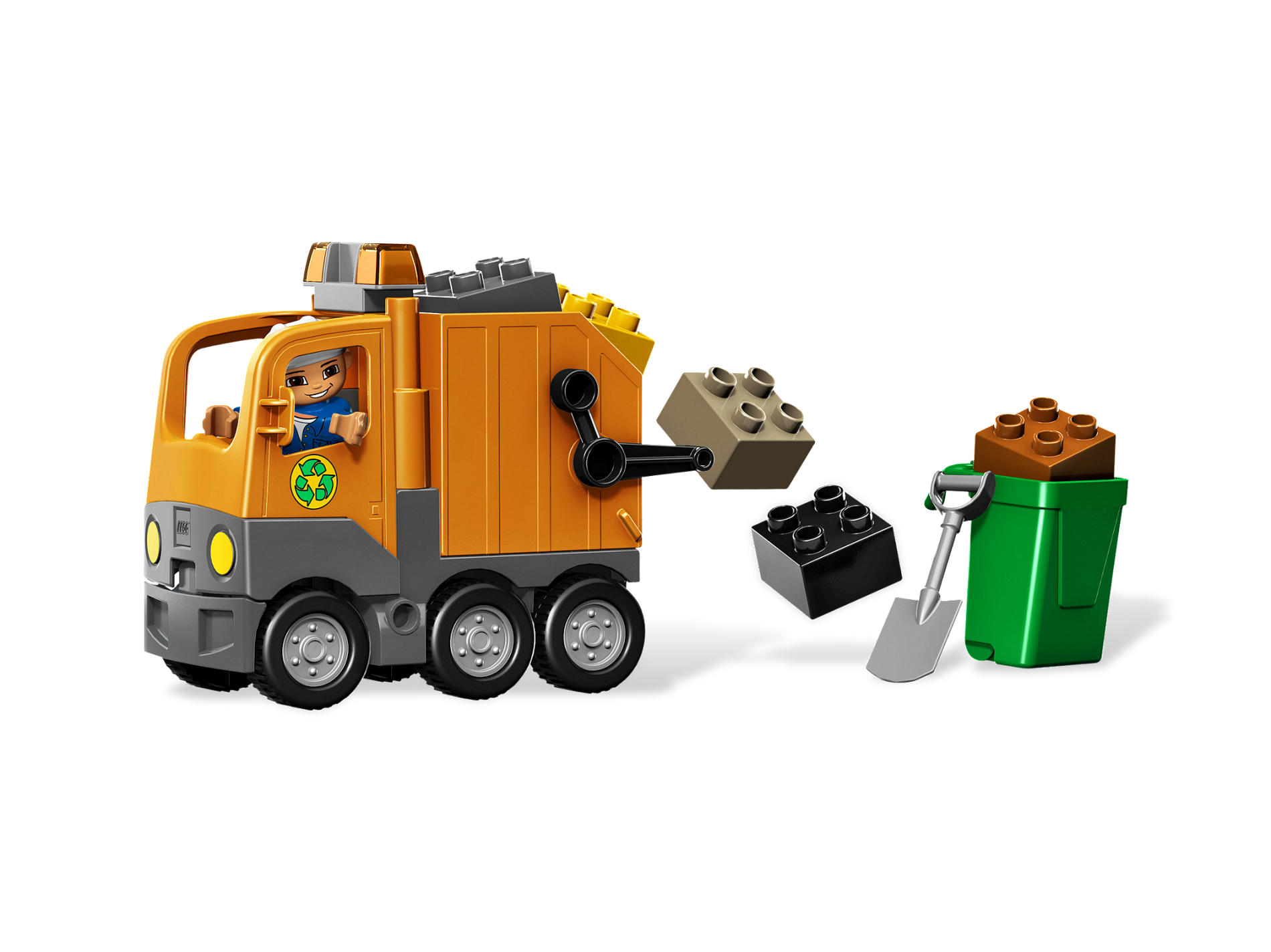 Here comes the big garbage truck, rolling up the street to keep the town clean! The garbage man shovels up bricks, then loads them into the can for the truck to tip into its back and drive away. DUPLO pieces are sturdy and safe for smaller hands! Perfect for younger builders! Includes truck, can, sanitation figure, shovel, and DUPLO bricks! Tip the can into the back of the truck! Measures over 4 inches (10cm) long by 3 inches (7cm) wide and 5 inches (12cm) tall!