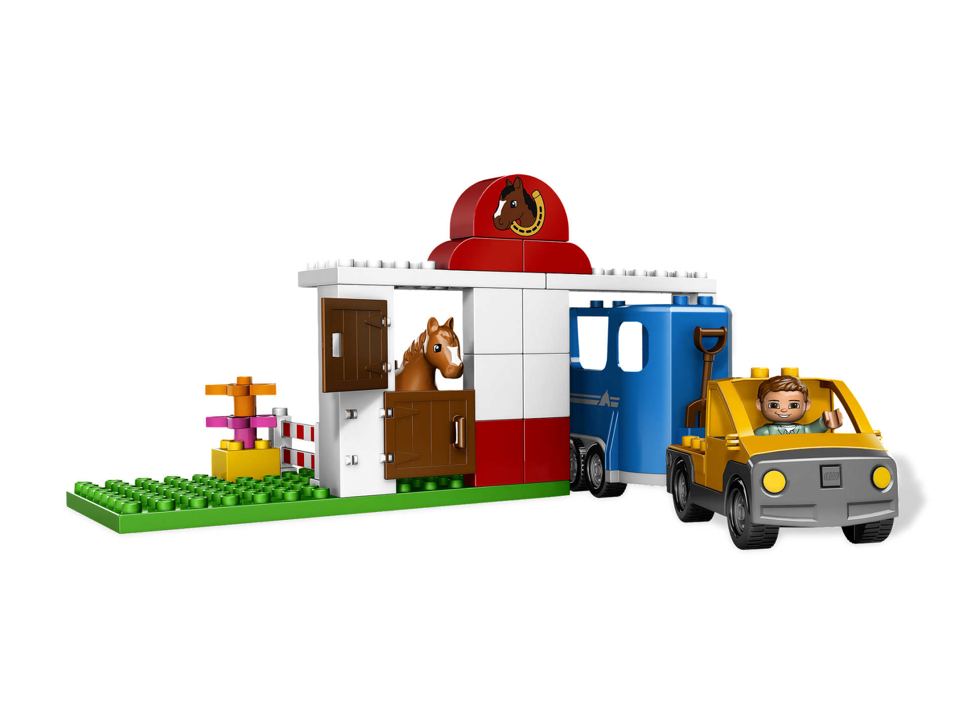 | 1 X Duplo Horse Trailer with Dark Bluish Gray Base and Silver Stripes and Horse Head Pattern | Blue |   |  |