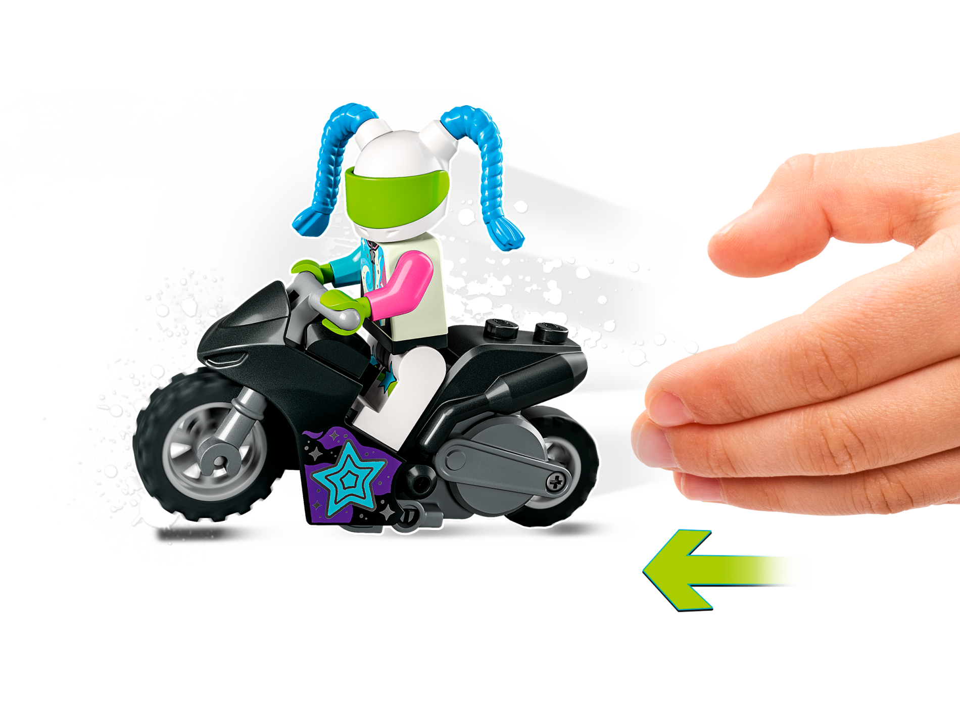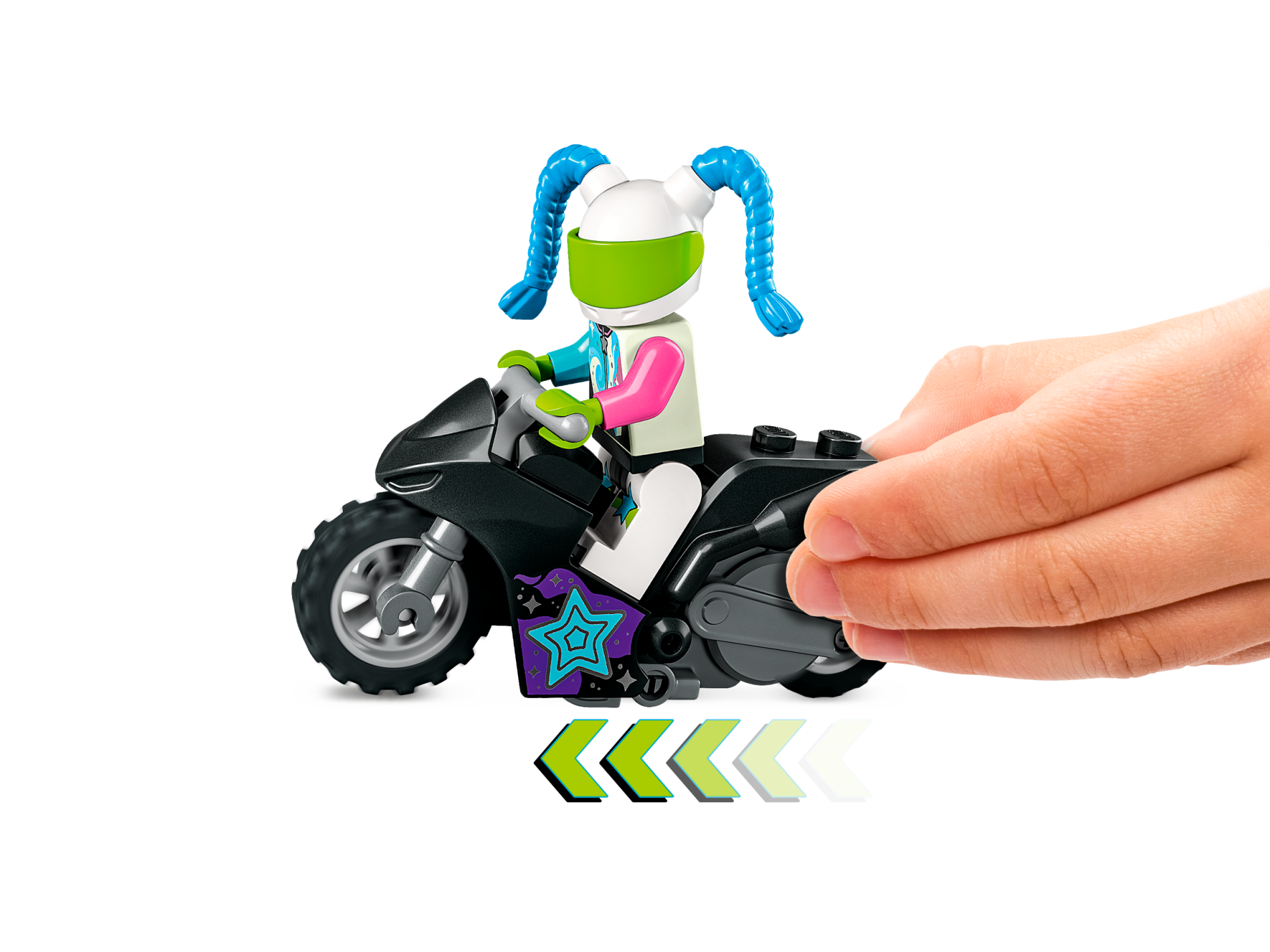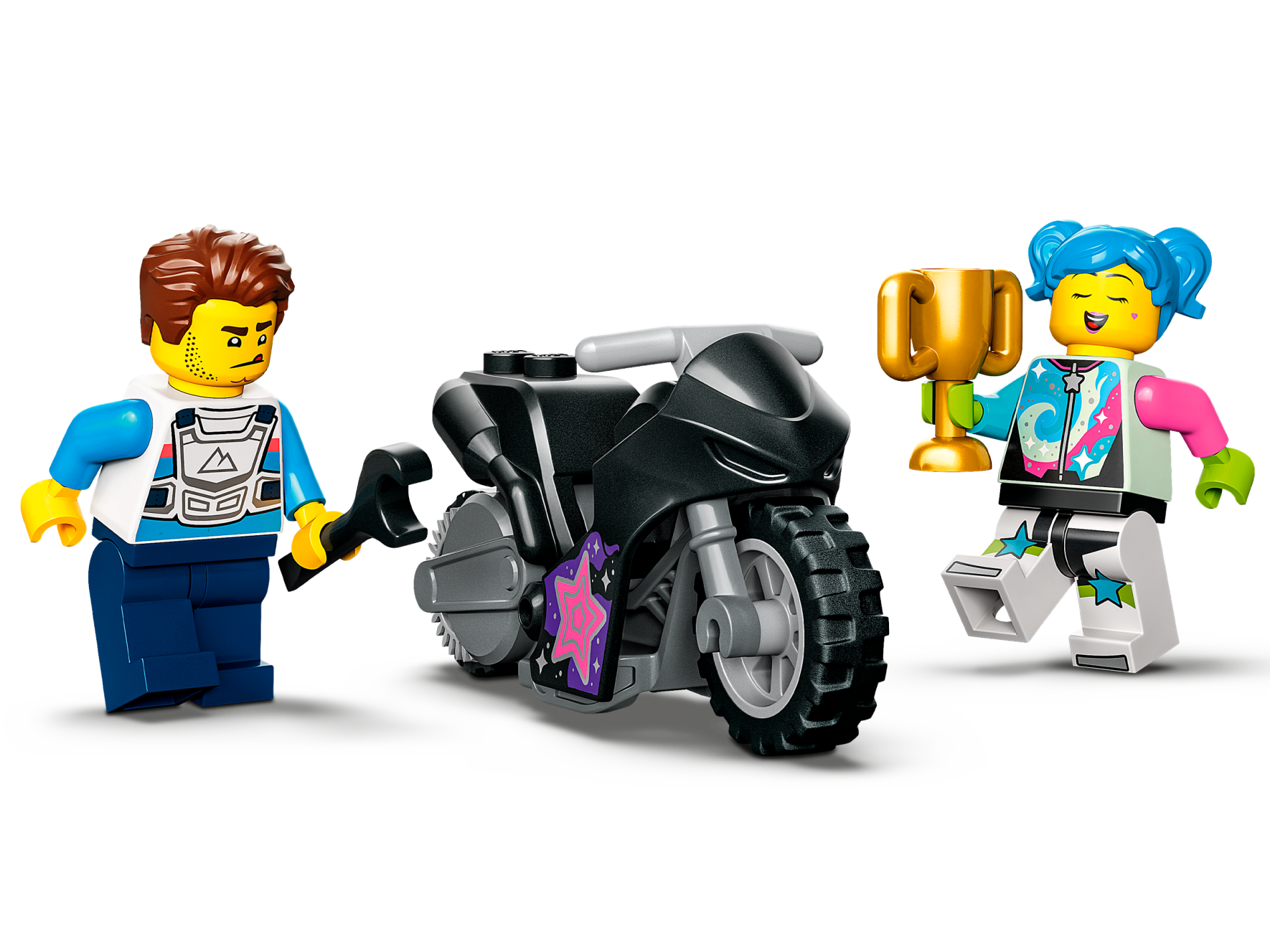 Stuntz Flywheel Motorcycle Sport Bike with Dark Bluish Gray Frame, Light Bluish Gray Handlebars and Wheels with Medium Azure, Dark Pink, and Silver Stars Pattern