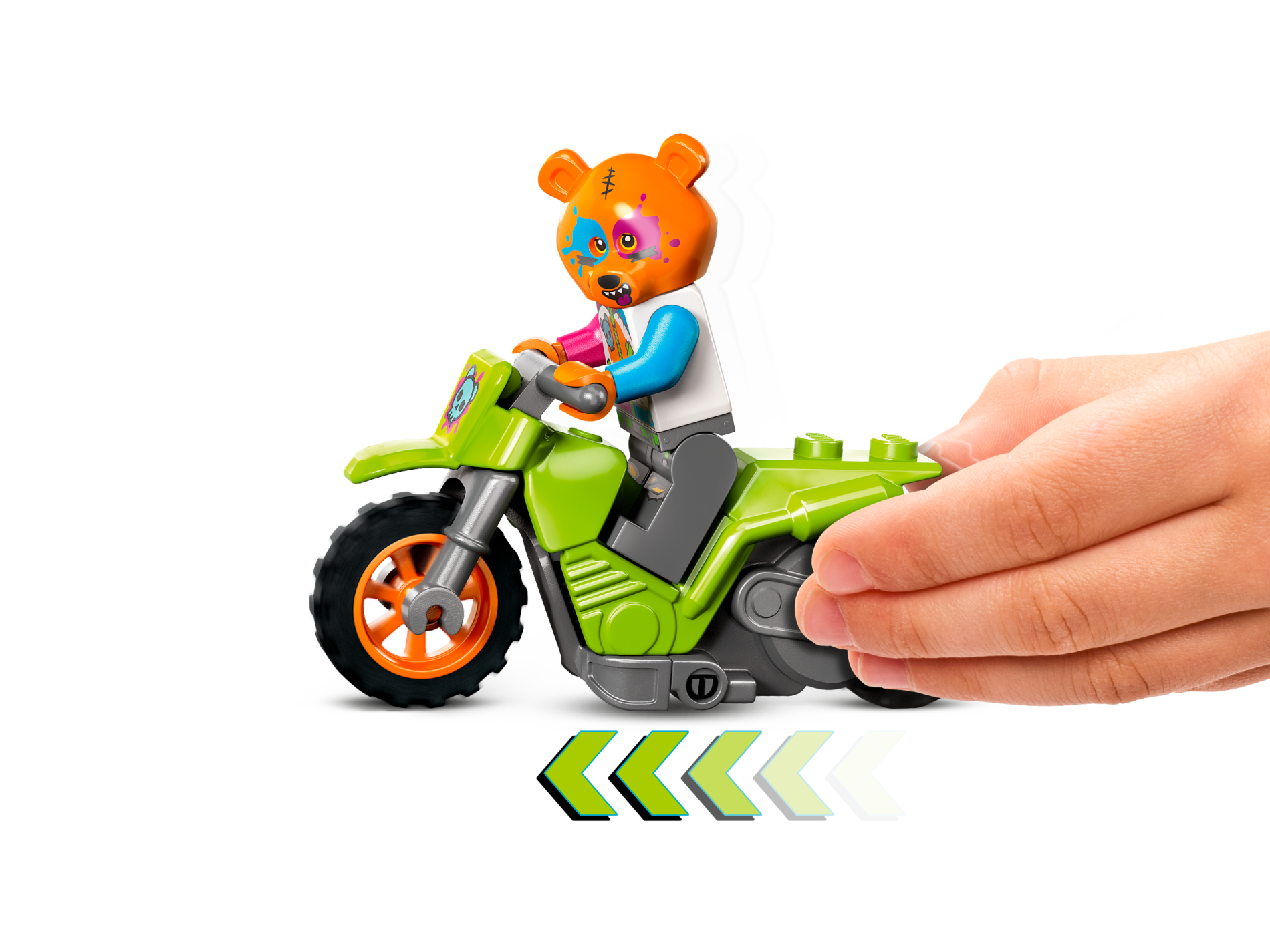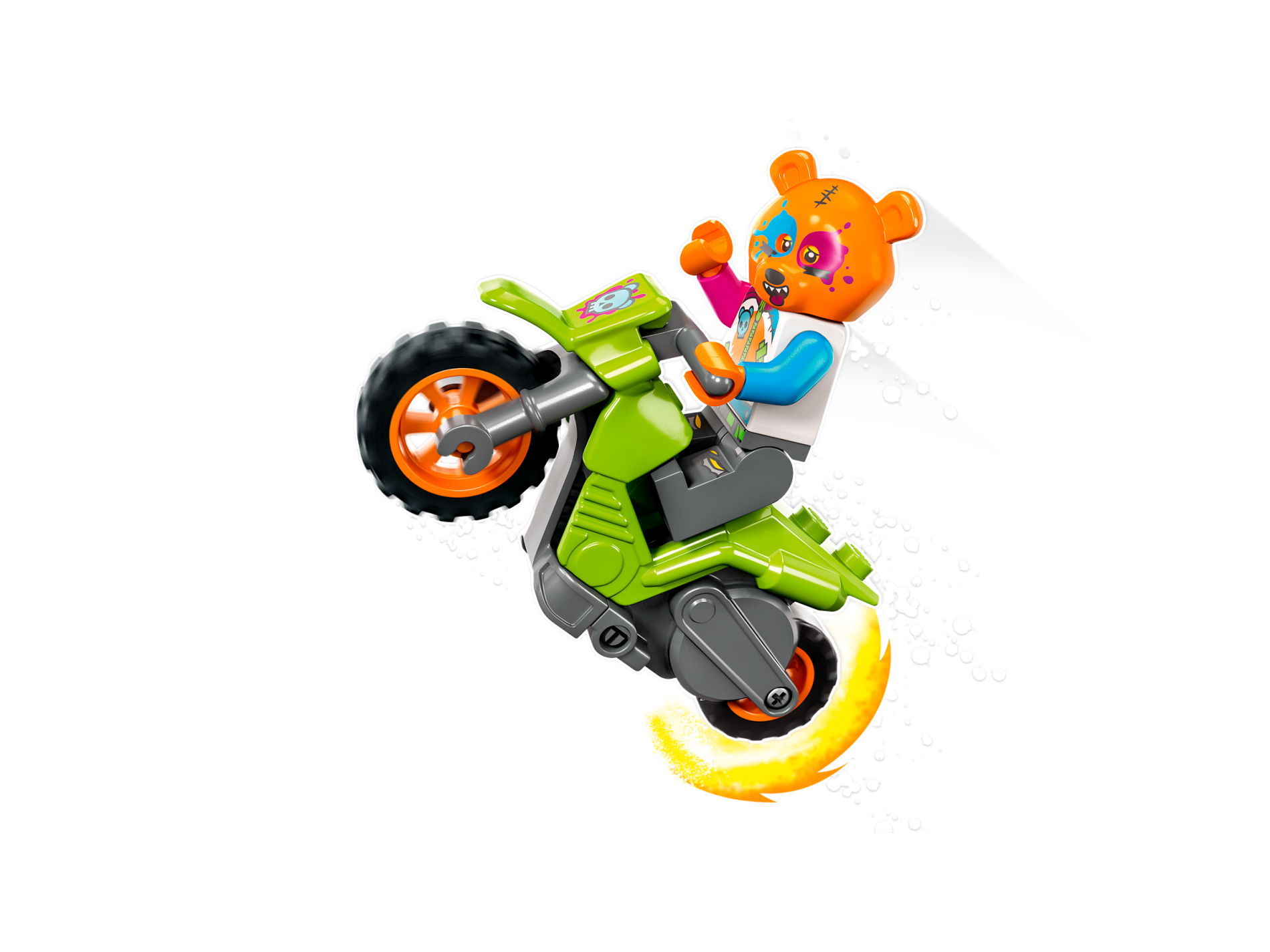 Stuntz Flywheel Motorcycle Dirt Bike with Dark Bluish Gray Frame and Handlebars, Orange Wheels, and Metallic Light Blue Bear Skull on Magenta Splotch Pattern