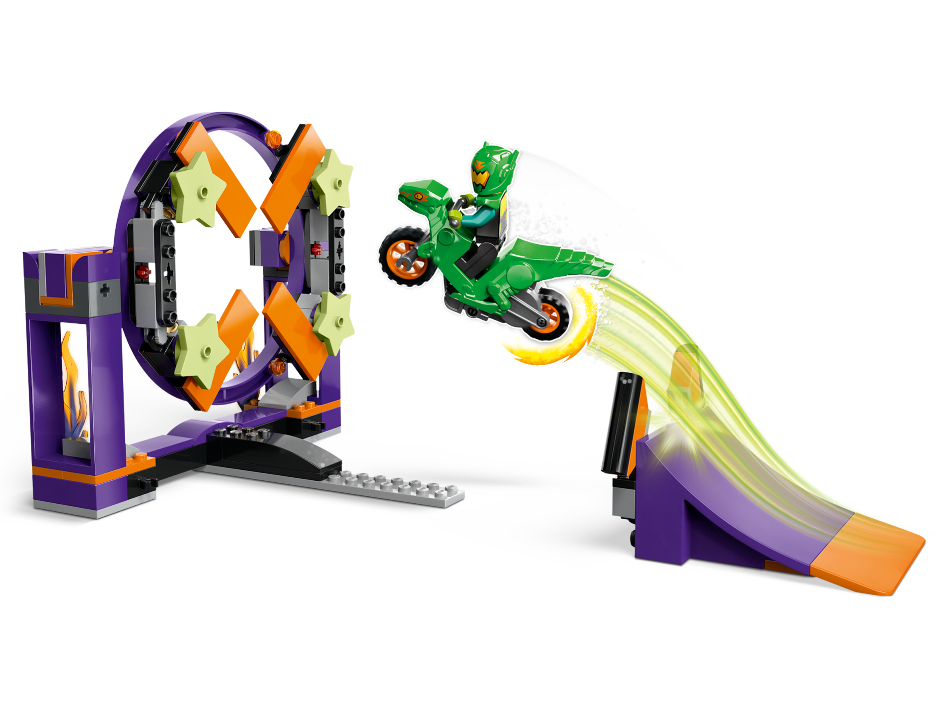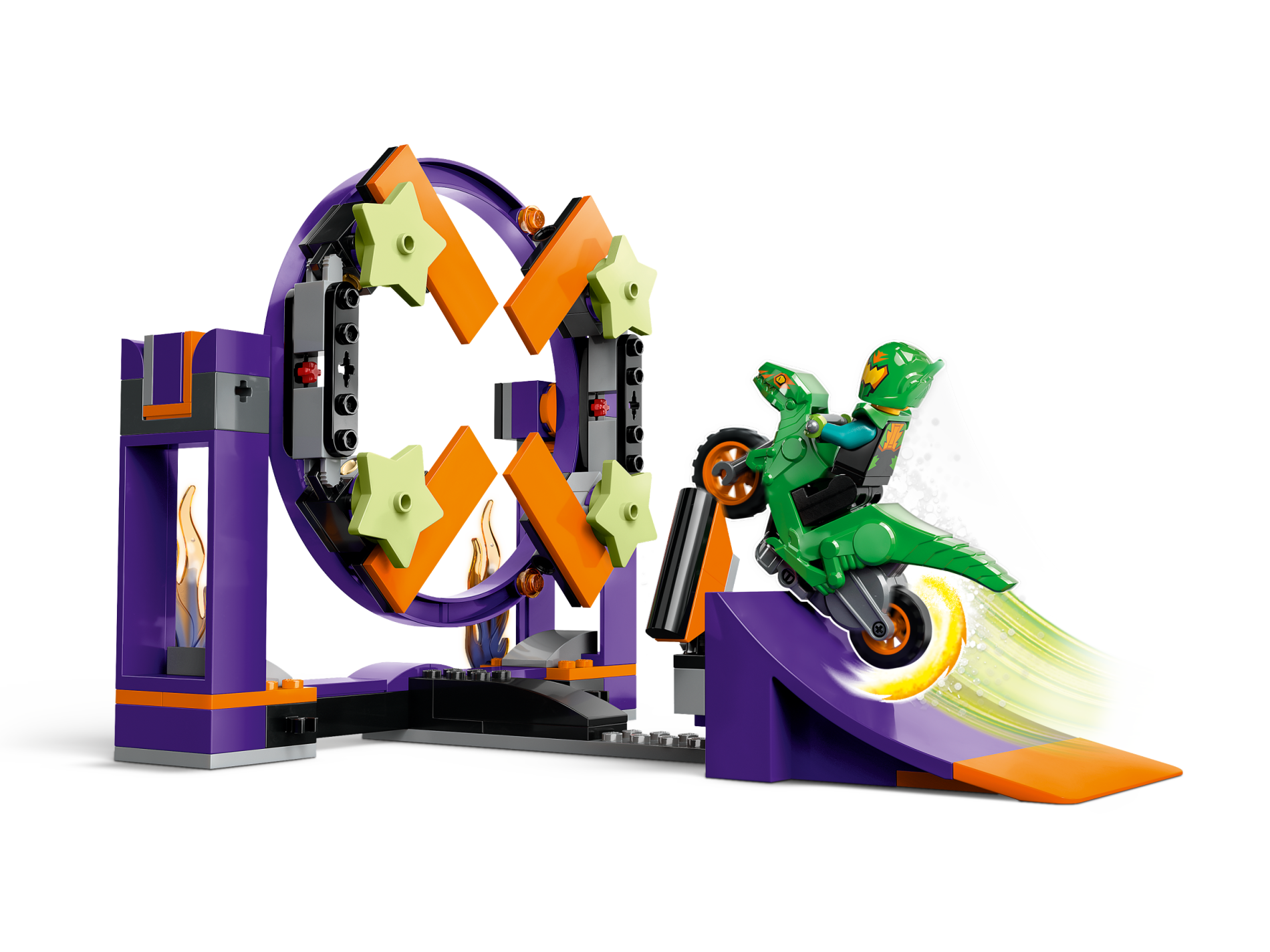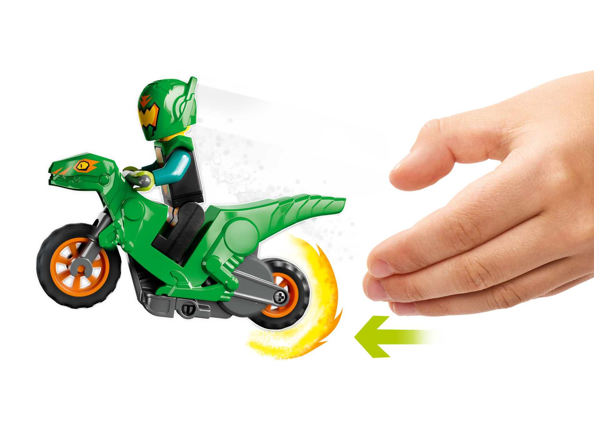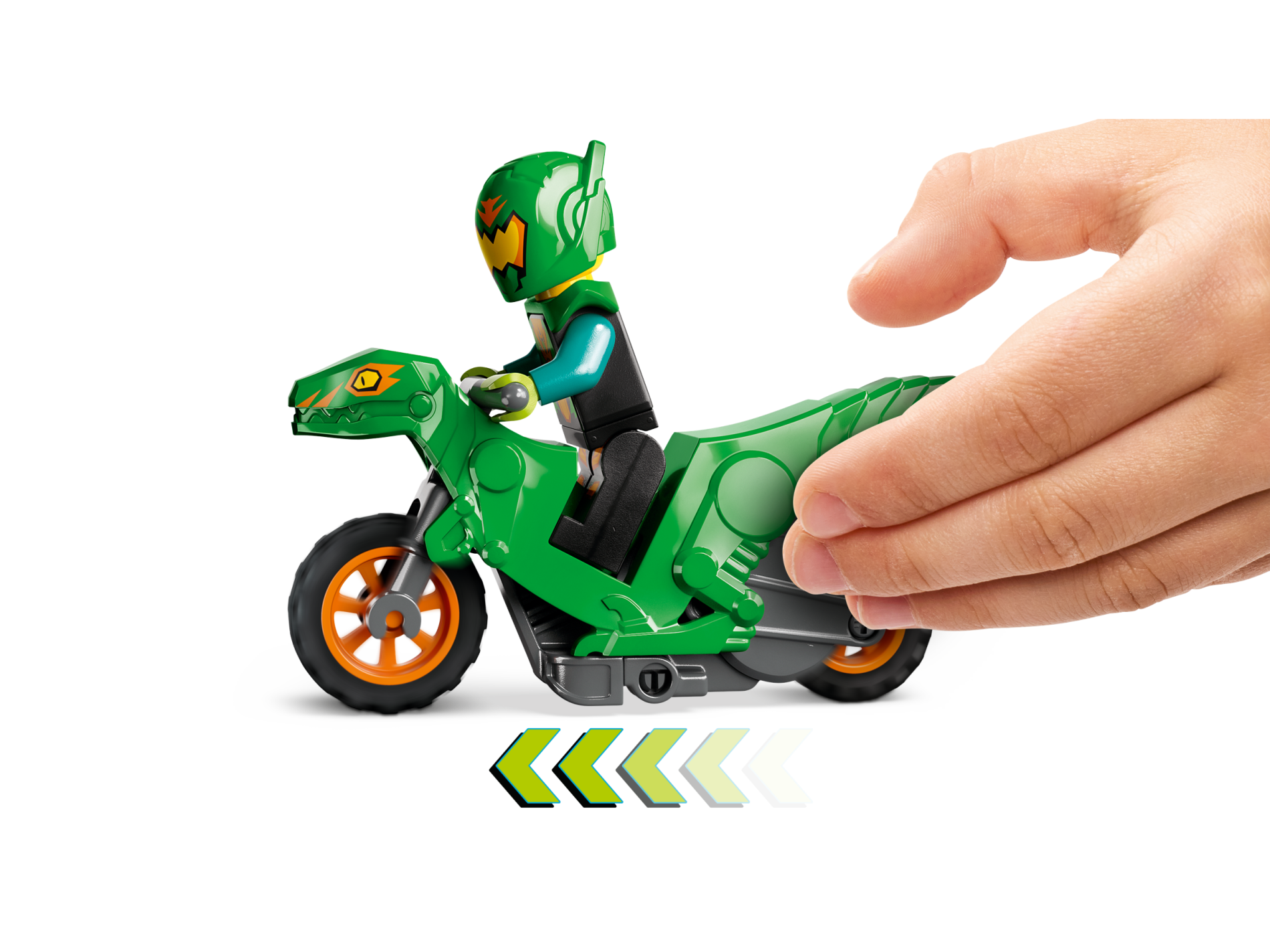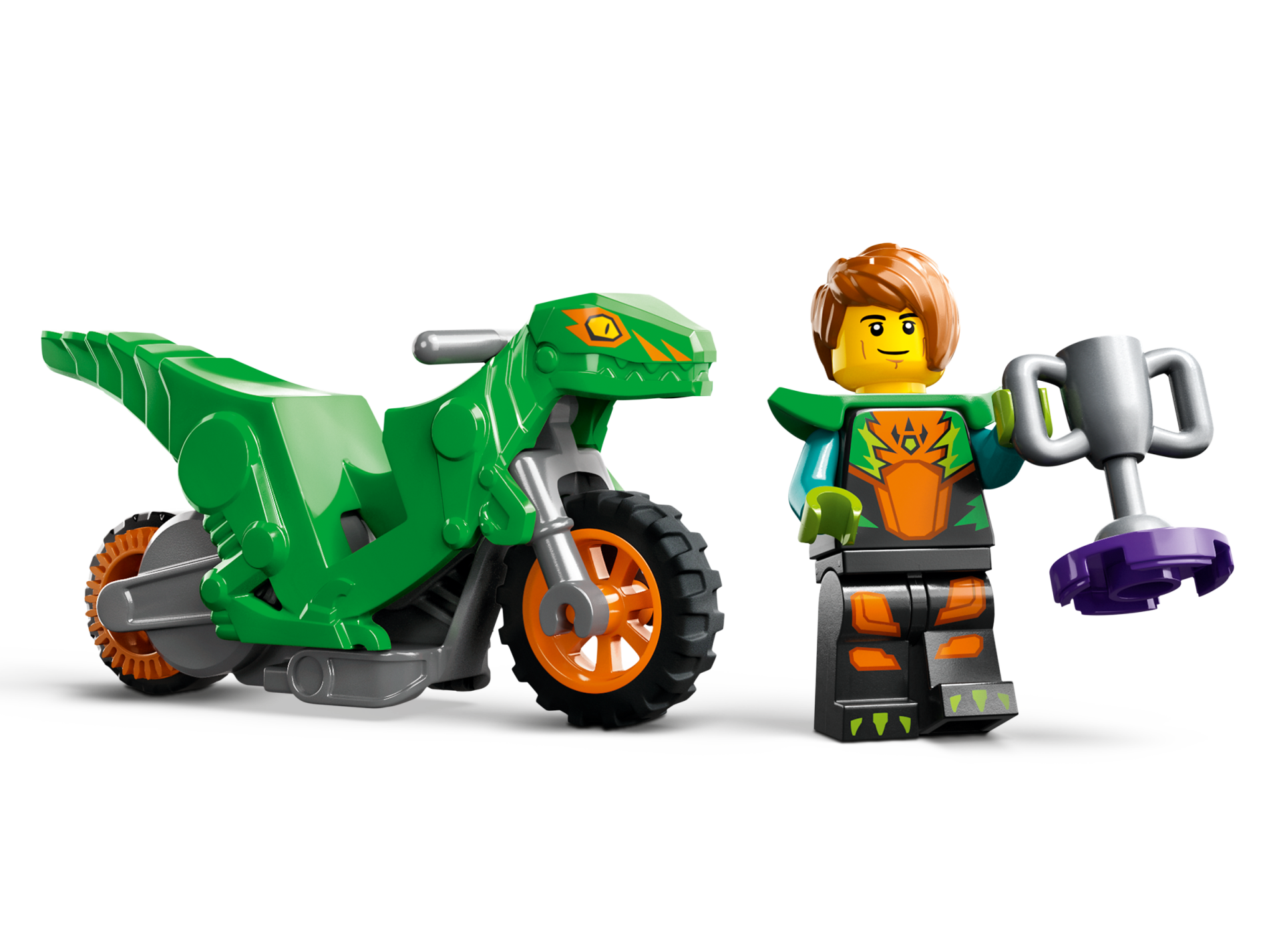 | 1 X Stuntz Flywheel Motorcycle Velociraptor Bike with Dark Bluish Gray Frame, Orange Wheels, and Dark Bluish Gray Handlebars with Yellow Eyes and Orange Markings Pattern | Bright Green |   |  |