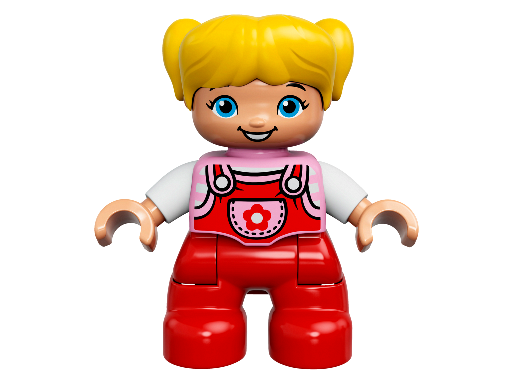 Duplo Figure Lego Ville, Child Girl, Red Legs, Bright Pink Top with Flower on Pocket, White Arms, Yellow Hair