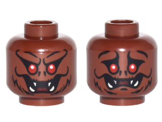 1 X Minifig, Head Dual Sided Alien with Fangs, Red Eyes and Fur Smiling / Worried Pattern - Stud Recessed Reddish Brown